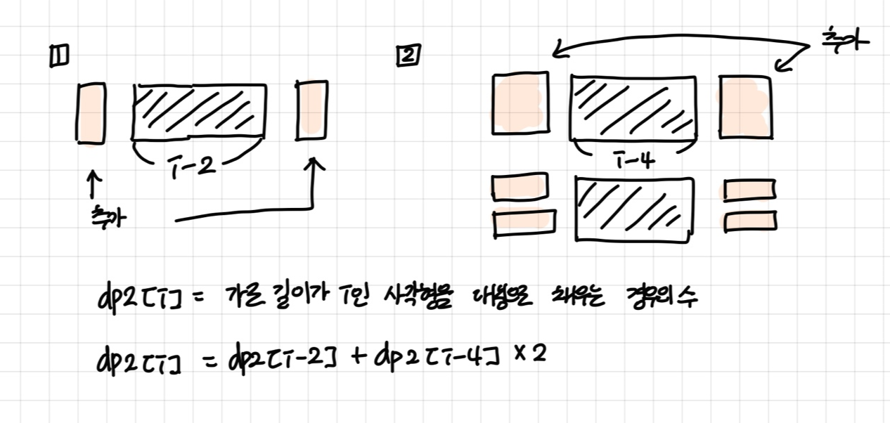처음에는 좌우 대칭인 코드의 수, 좌우 대칭이 아닌 코드의 수를 따로 계산하려고 했는데, 좌우 대칭인 코드를 구하는 것은 쉽다. 길이-2의 경우에 각각 앞뒤에 2*1사각형 추가, 길이-4인 경우에 각각 앞뒤에 2*2, 1*2*2인 사각형 추가해주면 된다.